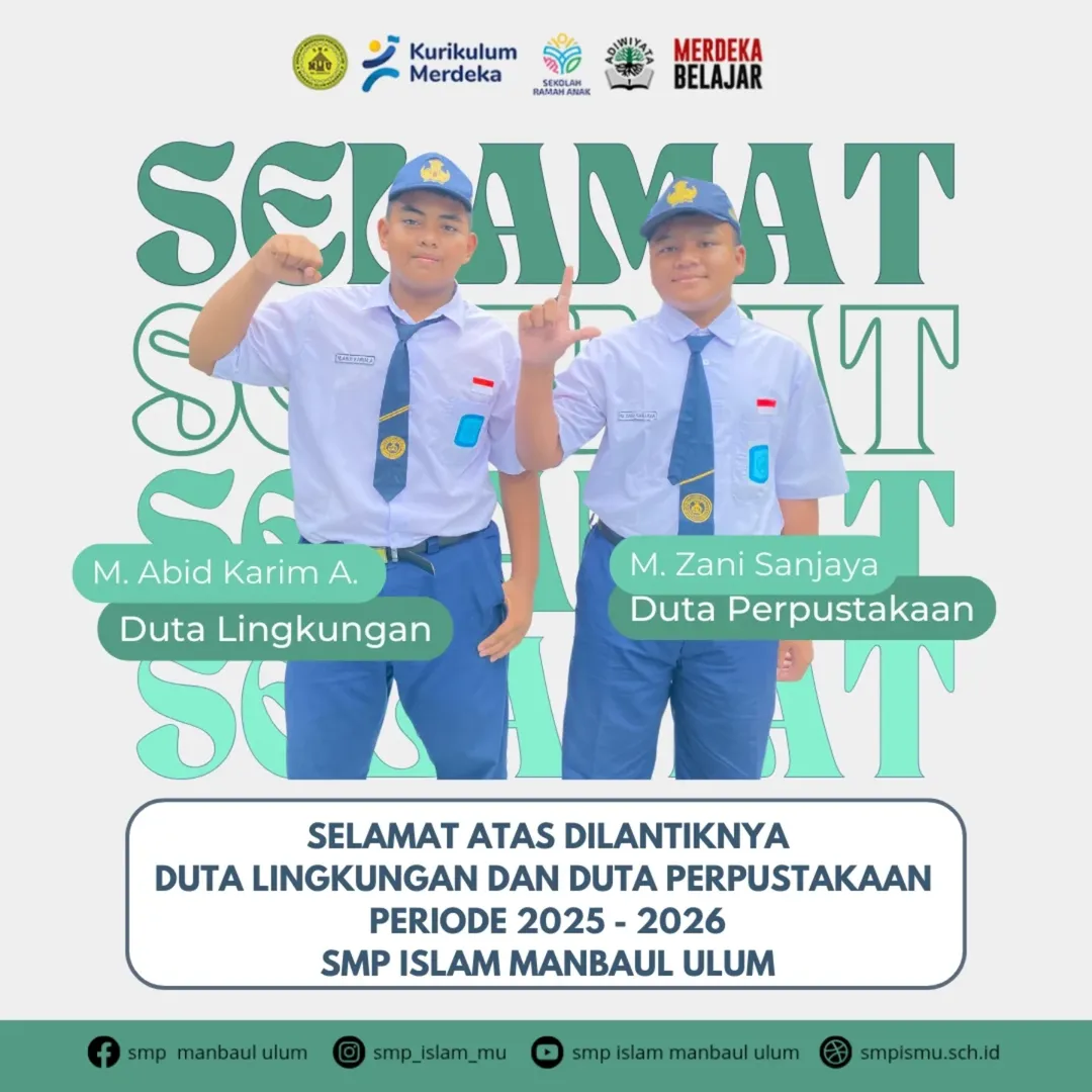 Selamat kepada M. Abid Karim A. sebagai Duta Lingkungan dan M. Zani Sanjaya sebagai Duta Perpustakaan SMP Islam Manbaul Ulum periode 2025–2026! 👏